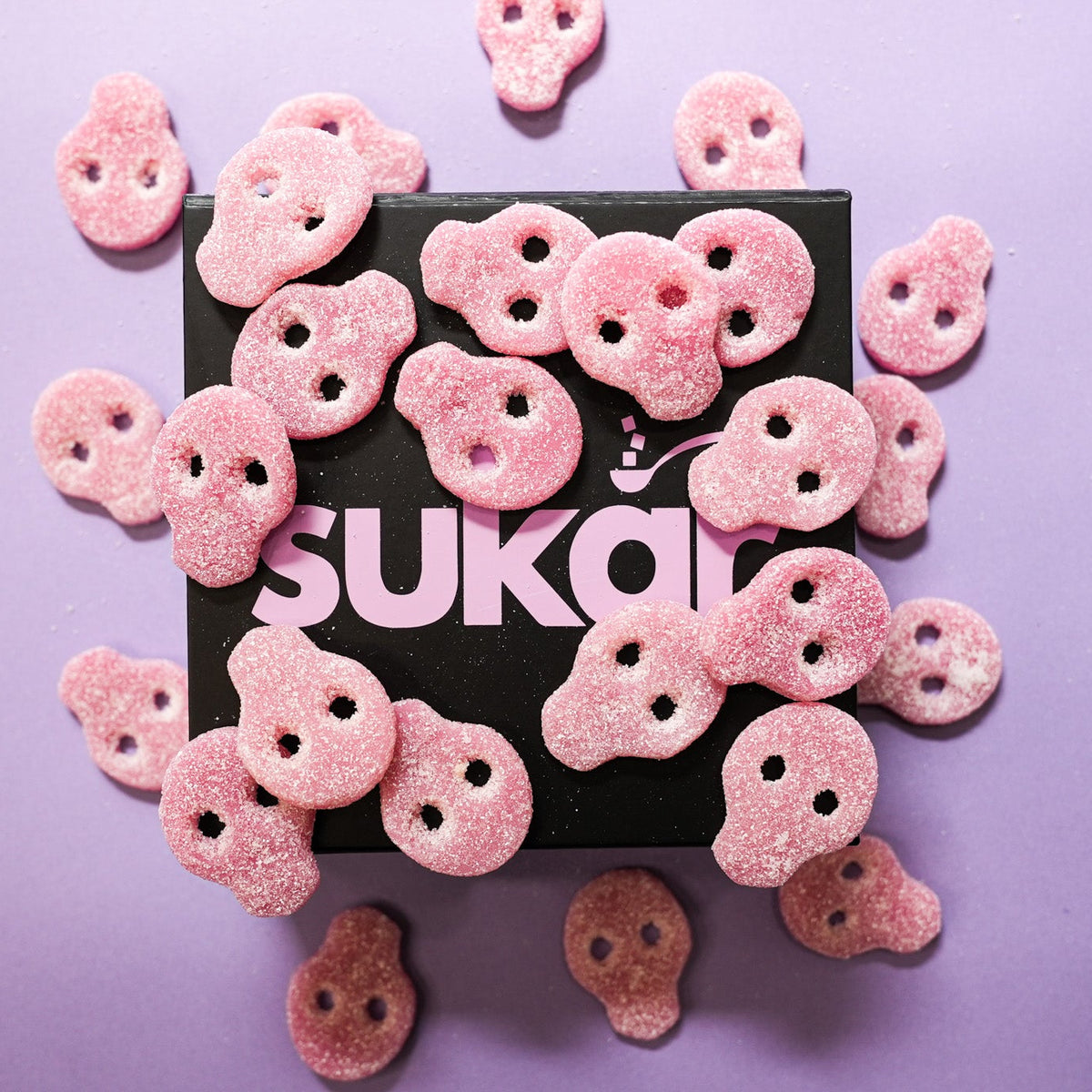 Unleash your taste buds with Sour Pink Skulls! These chewy strawberry-flavored gummy skulls are covered in sour dust, giving you the perfect balance of sweetness and tanginess. A unique and playful snack (or prank) for any occasion. These candies are Gelatin-Free, Gluten-Free, and Vegan!